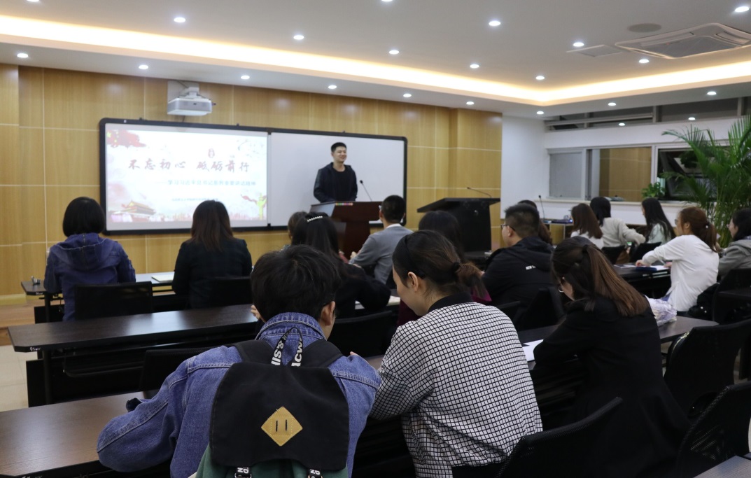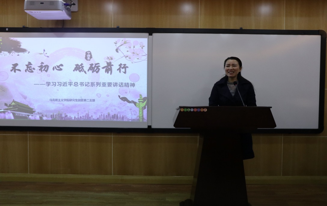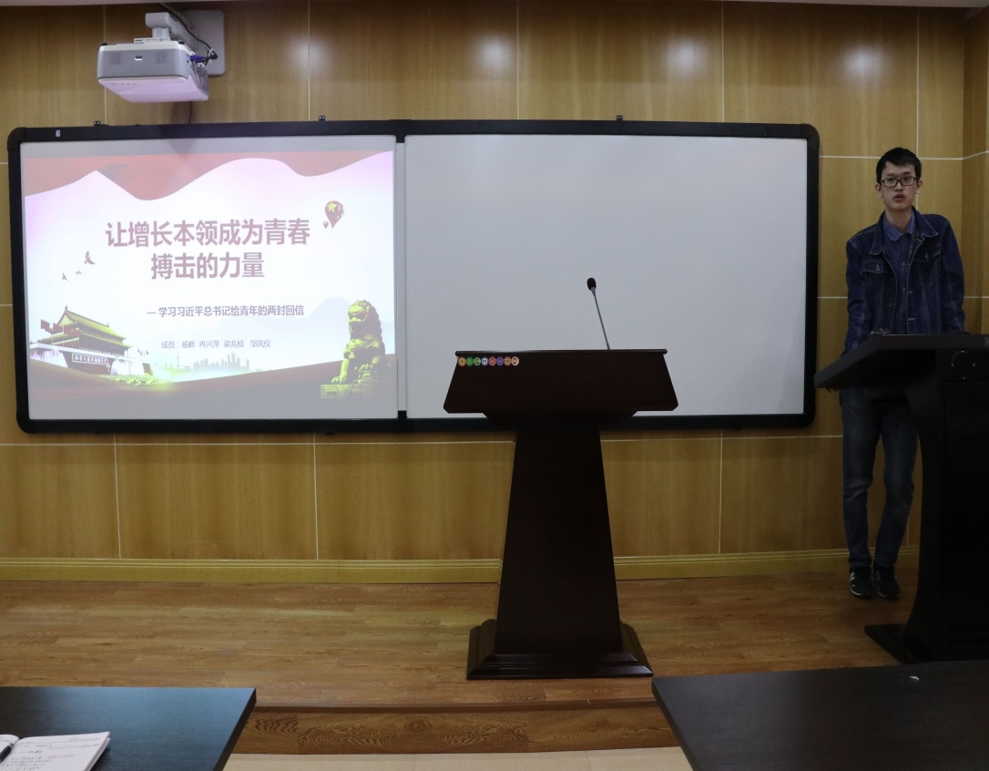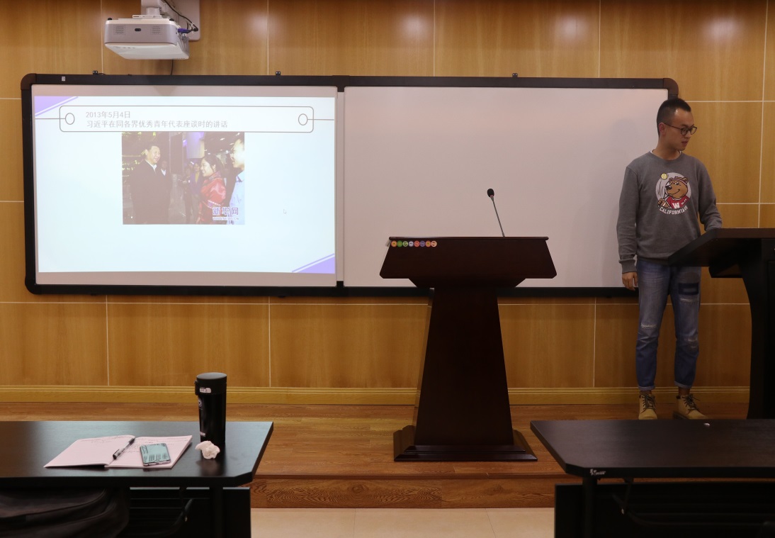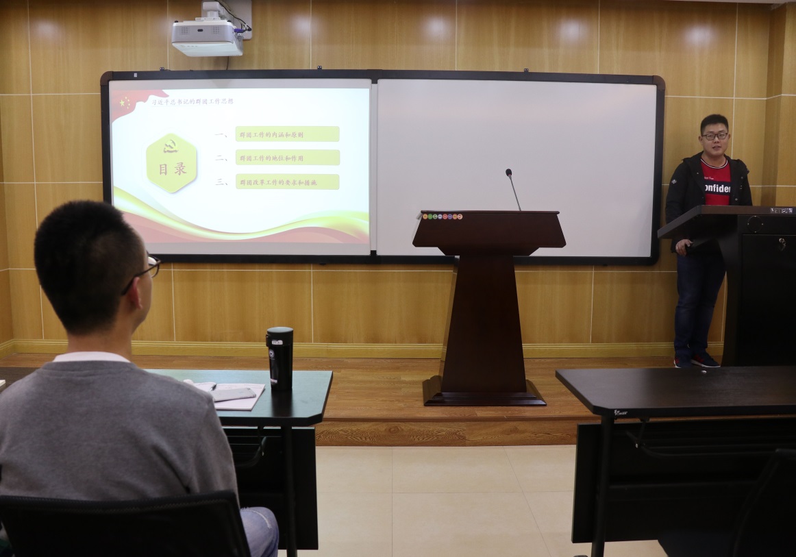 马尚明同学代表第四小组,以“习近平总书记的群团工作思想”为主题,汇报了群团工作的内涵和原则、群团工作的地位和作用以及群团改革工作的要求和措施。汇报末,马尚明引用习近平总书记话语“只有把人生理想融入国家和民族的事业中,才能最终成就一番事业”与同学们互勉。