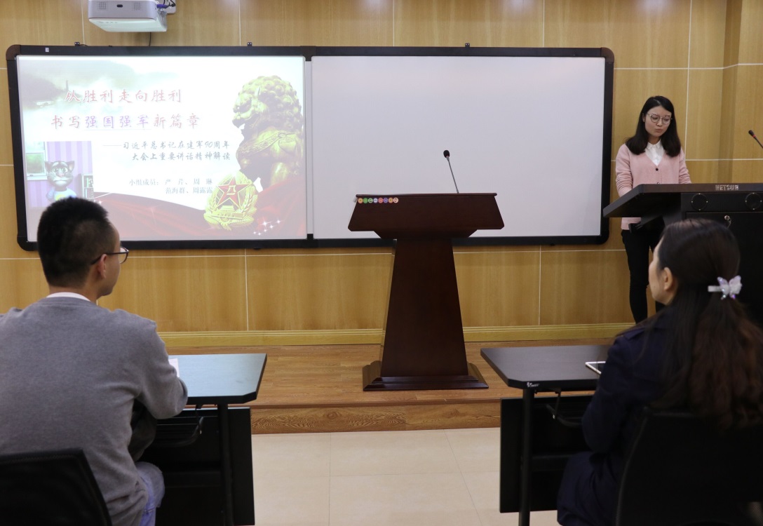 周琳同学代表第二小组,以“从胜利走向胜利,书写强国强军新篇章——习近平总书记在建军90周年大会上的重要讲话精神解读”为主题,向同学们汇报了习近平总书记在建军90周年大会上重要讲话的综述、习近平总书记在建军90周年大会上的讲话精神和习近平总书记在建军90周年大会上的讲话释放的五大信息。周琳向大家展示了中国人民军队的强大力量和伟大精神,表达了对于人民军队的崇高敬意。
