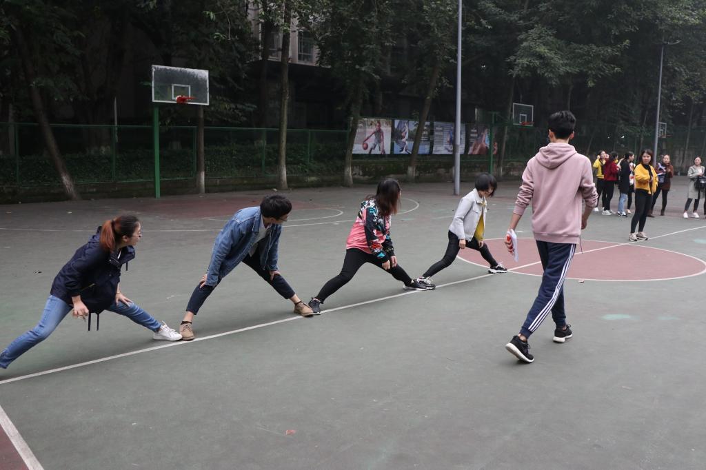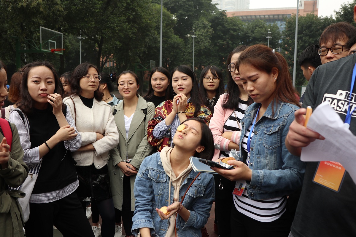 参与趣味闯关游戏的同学一每组5人进行,分别要通过运球投球、投乒乓球、背人跑、劈叉接力、转圈跑五关方可顺利完成,用时最少者获胜。男女搭配活动要求男女生合作完成喝水吃橘子、投乒乓球、背人跑、俯卧撑、转圈跑五个环节,耗时最少者胜出。最后一个项目是我的面部会跳舞,要求参赛者将饼干置于额头,通过面部活动把饼干运至嘴中算过关 , 数量最多者获胜。每一个游戏现场都充满了欢声笑语。