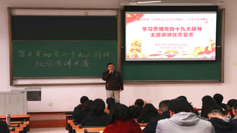 举办了以学习十九大精神为主题的演讲比赛。各参赛选手运用马克思主义基本原理的立场、观点和方法,以即兴演讲的方式,结合自身的学习与生活实际,独具个人风格与特色地展现了他们对党的十九大精神的理解和认识,充分展现了新时代大学生不忘初心、牢记使命、勇于担当,争做德才兼备的社会主义合格建设者和可靠接班人的决心和信心;也充分表达了新时代大学生对党和国家的拥护和热爱,以及树立远大理想、勇于担当,为中华民族伟大复兴贡献力量的豪情壮志。