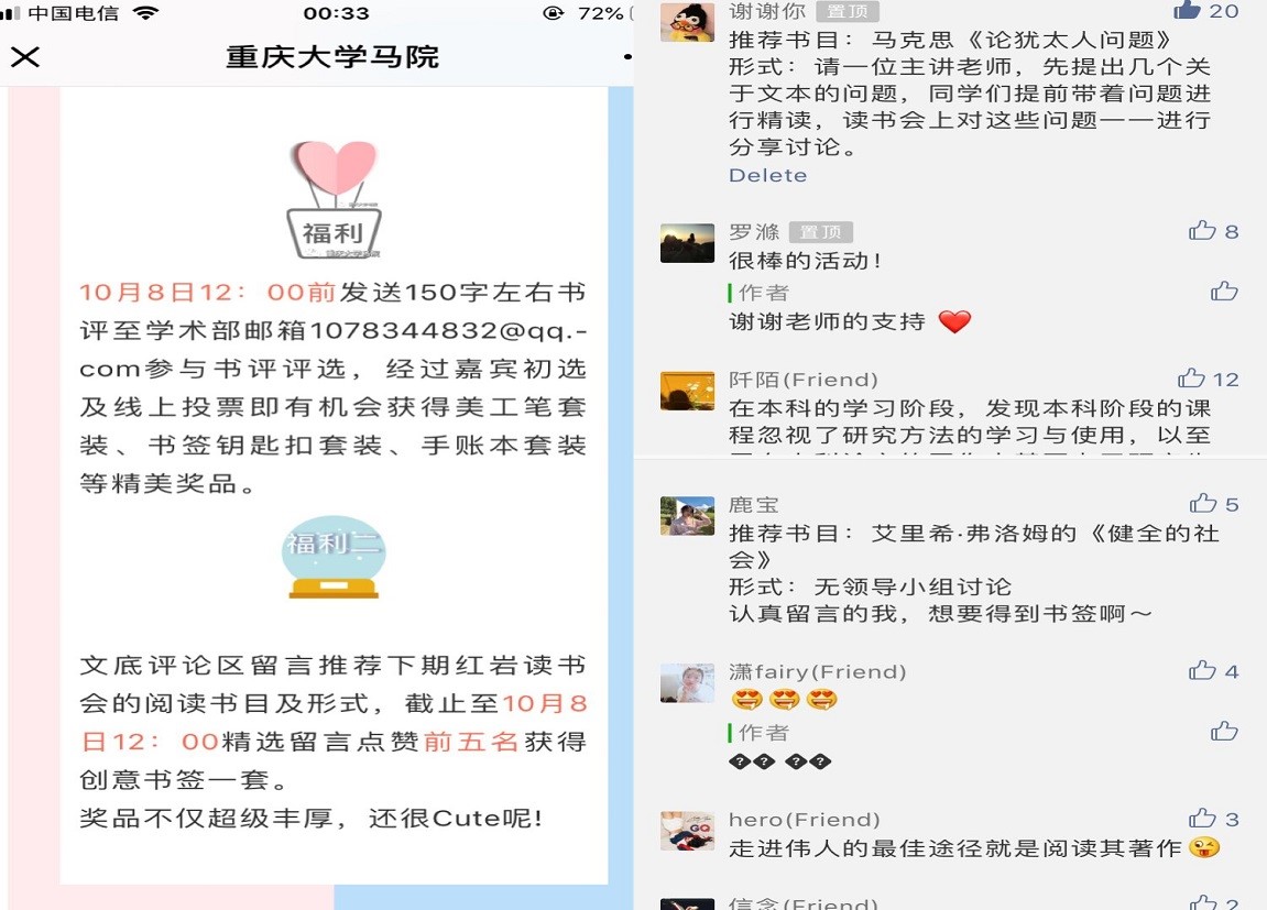 线上活动于9月25日至10月8日展开,分为“《1844年经济学哲学手稿》书评评选”和“公众号留言推荐书目”两个环节,旨在通过线上平台,激励同学们广泛参与到读书活动中来。