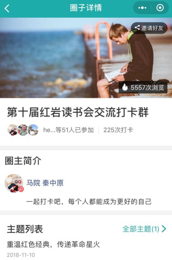 线上活动“一周打卡计划”于11月9日至11月15日展开,报名参加红岩读书会的同学在推荐书目中挑选自己感兴趣的书籍,并通过微信小程序“小打卡”的阅读圈里进行每日打卡,分享每日读书心得。