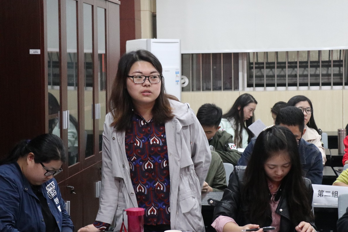 活动伊始,读书会进入分享讨论环节,马尚明同学就“中国道路为什么是对的”代表第一小组作分享,他从中国道路的内涵、坚持中国道路的原因、中国道路的未来展望三个方面进行了阐述 。分享结束后,他提出“中国道路的标准和动力是什么?”这一问题和大家作交流。第二小组代表何丽玲同学则以十九大提出的社会主义新矛盾为题作分享,最后就 “新时代下人民群众需求的特点以及马克思主义理论专业学生可以做哪些努力?”这一问题与大家进行交流。第三组代表韩梦馨同学从“新时代、新内涵、新路径、新思想”四方面为大家作分享,根据分享内容抛出“党的建设为何是关键?”这一话题与大家讨论。接下来是第四组卫婷婷同学为大家分享“四个伟大”,与大家交流其内在逻辑。最后,第五组代表马小帅同学从新思想、新时代两个角度进行分享。每组分享结束后限五人进行抢答交流。同学们积极参与,经过四轮激烈角逐,第二小组同学拔得头筹,小组成员均获得一份礼品。
