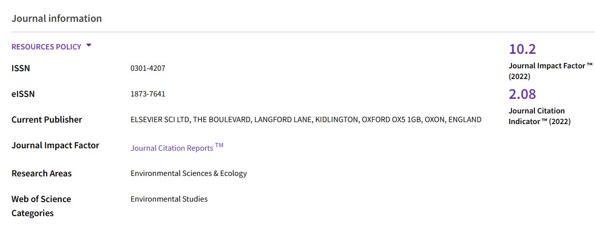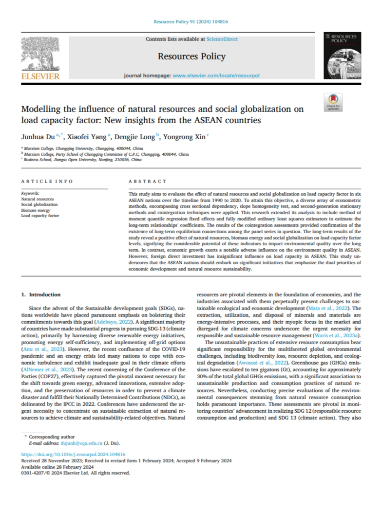 杜俊华教授(通讯作者)阐释1990年至2020年期间自然资源和社会全球化对东盟6个国家载客量系数的影响的英语论文《Modelling the influence of natural resources and social globalization on load capacity factor: New insights from the ASEAN countries》,发表在SSCI一区外文期刊《RESOURCE POLICY》2023年第91卷上。该期刊也是JCR一区论文,影响因子10.2