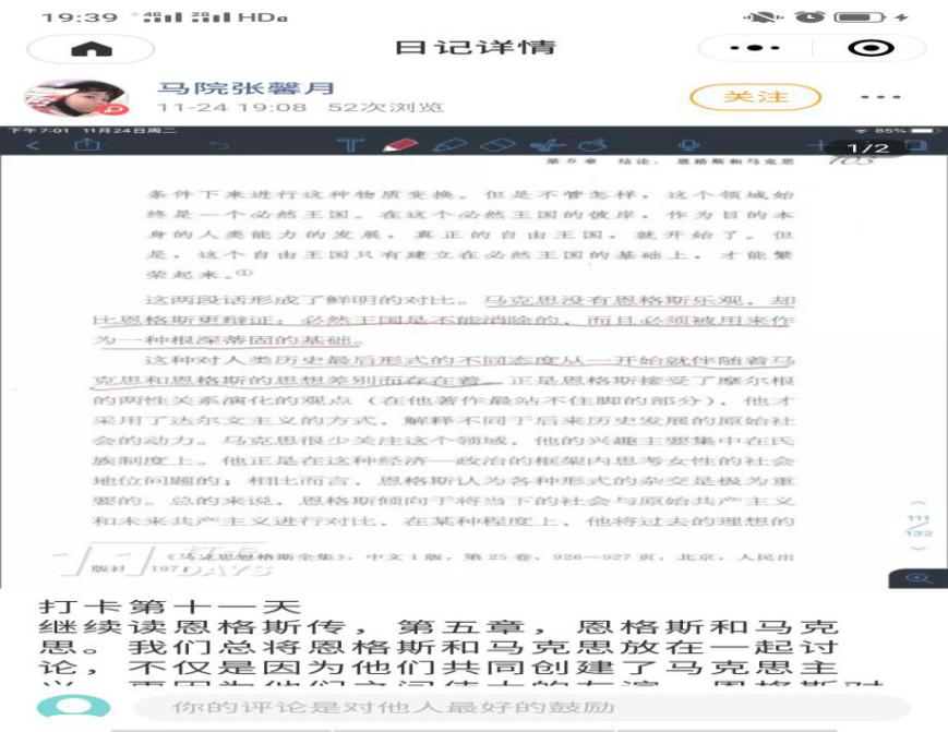 的徐淄浩同学表示:“这次‘红岩读书会’让我收获了别样的学习体验,感受到了恩格斯的精神风范和马克思主义的真理力量。”同时,他希望“红岩读书会”能够开辟更丰富的形式,开展更广泛的交流,引导更多的同学用实际行动践行科学信仰。