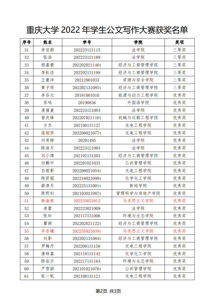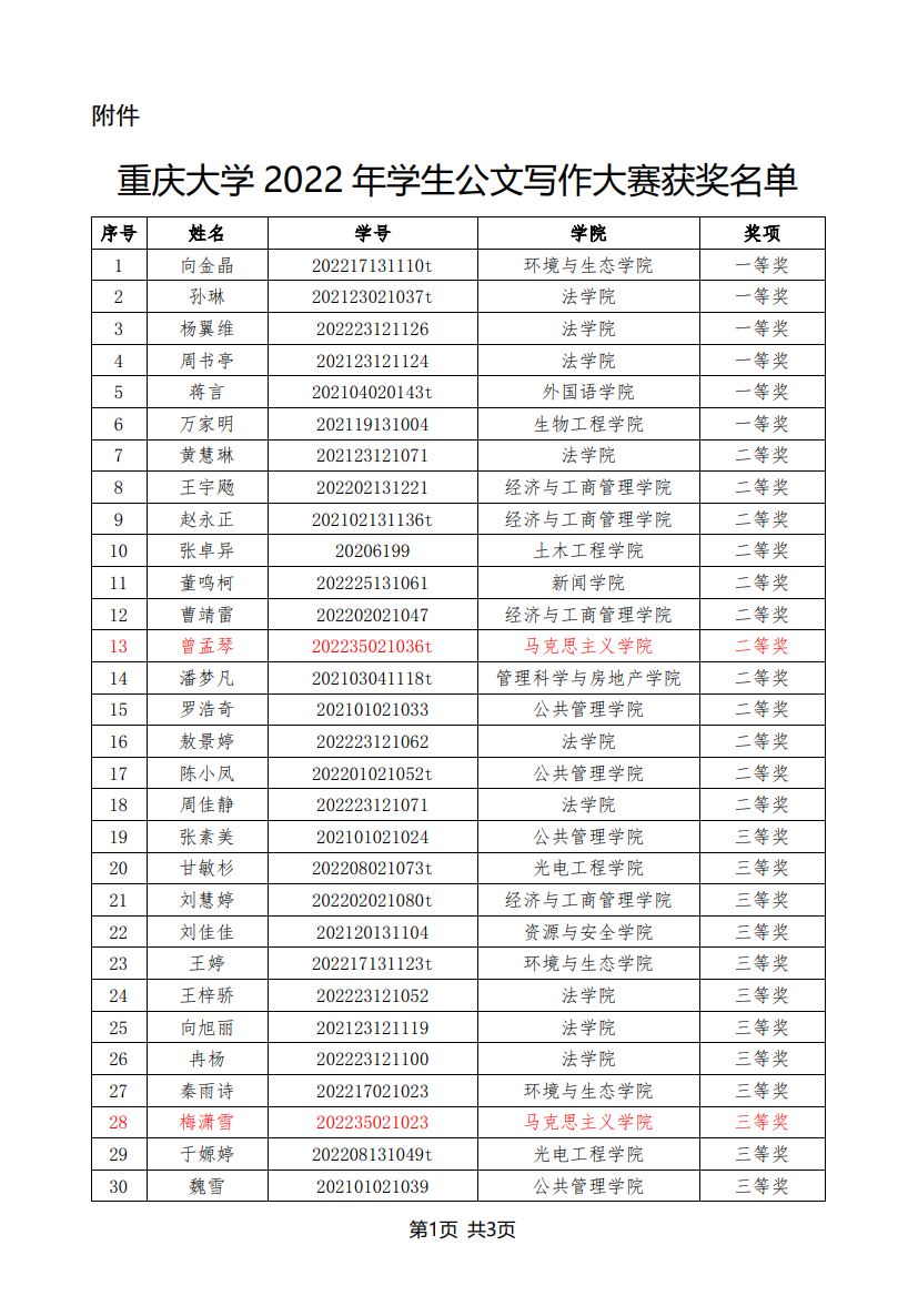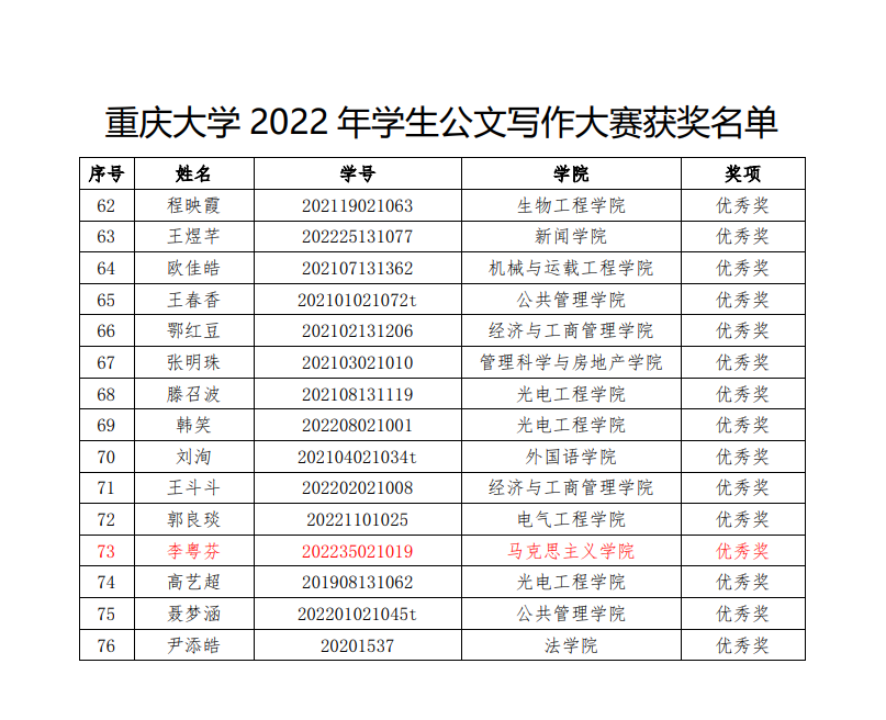在2022年11月至12月举办的“志公博学,明文定理”中文无码 2022年公文写作大赛中,中文无码 曾孟琴等5名研究生获奖,获奖名单如下: