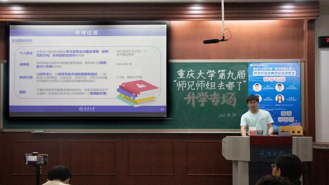 的郭慧慧、吴道福、邓鹏、彭洋4名优秀毕业研究生作经验分享,他们从升学规划、申博准备、申博过程、心理调节等多方面分享了自己在升学过程中面临的困难以及如何解决并取得心仪的offer。