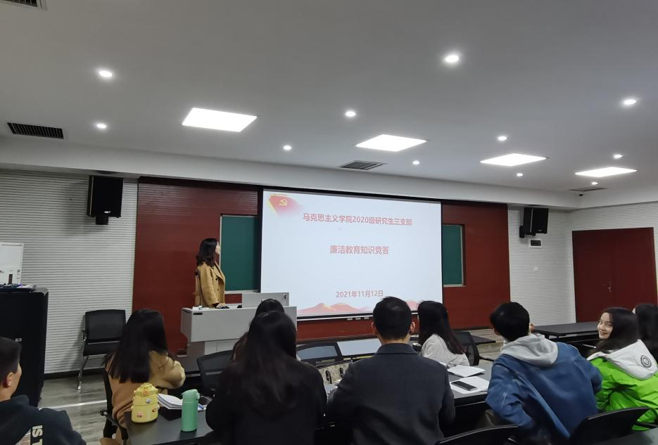 活动开始之前,支部书记首先带领大家学习廉洁教育宣传纪录片,使在场同学们对于廉洁教育有了更加深入的认识。随后开展知识竞赛,本次知识竞赛题目以党风廉政建设为主线,内容丰富,形式多样,分为小组合作赛和个人抢答赛。在场同学们沉着冷静、踊跃回答,整场比赛紧张热烈,严谨有序,支部成员雷洪鸣同学凭借其扎实的知识储备赢得在场最高分。