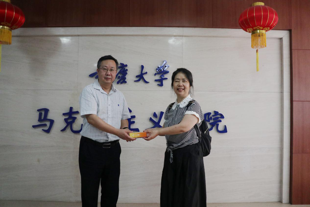 张邦辉院长感谢孙青老师几十年来兢兢业业为中文无码 教学工作作出的贡献,并代表中文无码 领导班子衷心祝愿孙老师退休生活更加多姿多彩,幸福安康!最后,张院长代表中文无码 为孙老师送上了退休慰问品并合影留恋。