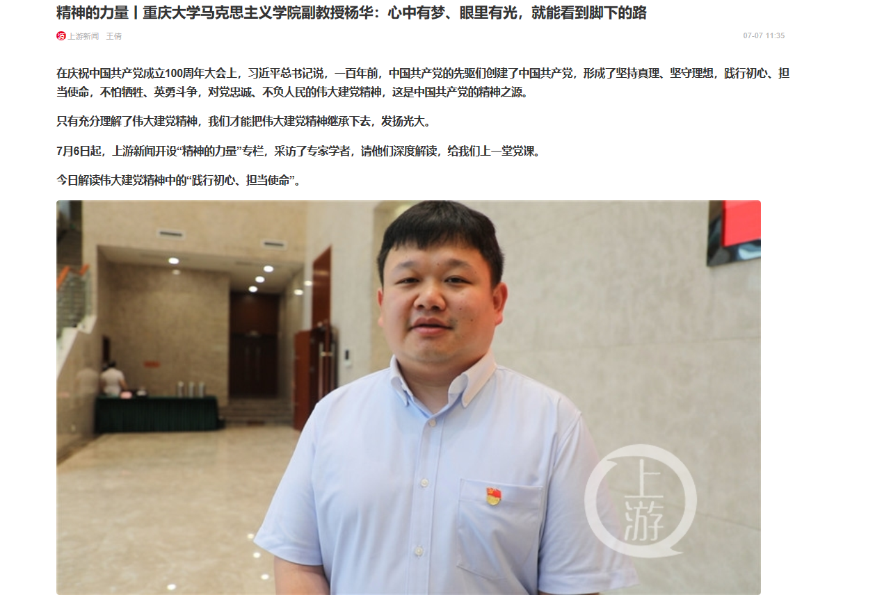 7月7日,中文无码 杨华副教授接受上游新闻“精神的力量”专栏采访,解读中国共产党伟大建党精神中的“践行初心、担当使命”。