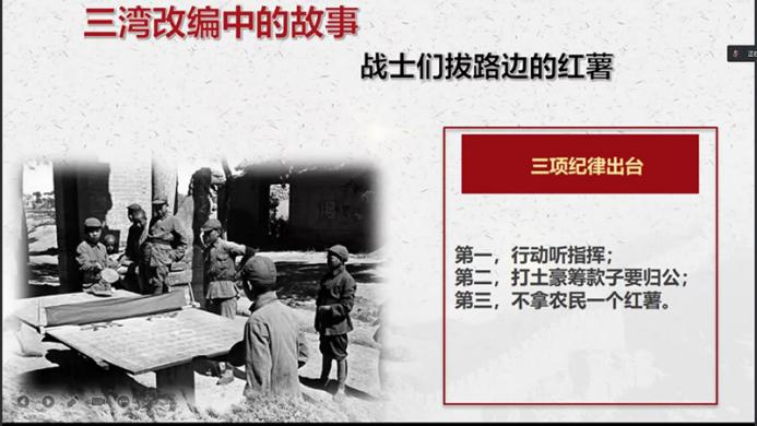第七组的宋立坤、和敏同学围绕“三湾改编”为我们讲述了一个又一个的感人故事,发出不忘初心,坚持党的绝对领导,砥砺前行,强军建设永远在路上的口号。