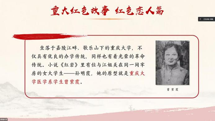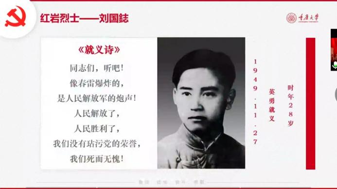 随后,第一组的李晶晶同学以“以青春颂歌浩然红岩之光”为主题讲述了红岩烈士刘国鋕的故事,通过视频、图片和文字带领大家回顾了革命英烈刘国鋕的一生,并发出了以理想之光照亮奋斗之路,以信仰之力开创美好未来的号召。