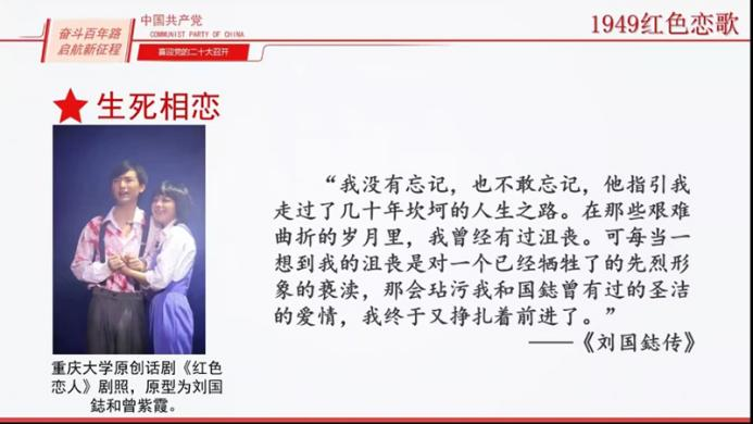 第二组的何静同学讲述了1949年的红色恋歌——刘国鋕和曾紫霞的故事,将一个更加生动、形象、丰富的革命烈士形象展示在大家面前。何静鼓励同学们要不忘初心、牢记使命,坚定不移的在党的指引下迈向辉煌的明天。