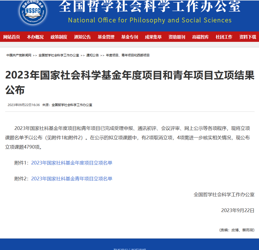 2023年9月22日下午,全国哲学社会科学工作办公室公布了2023年国家社科基金年度项目和青年项目立项结果名单。中文无码 吕进、杨长福两位老师获国家社科基金年度项目立项,王超、廖钰获国家社科基金青年项目立项。立项信息如下: