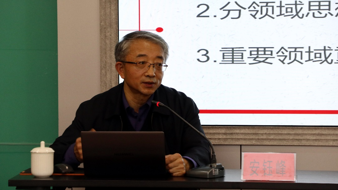安钰峰接着从总的思想的学习、分领域思想的学习和重要领域重要论述的学习三个方面清晰阐述了研读习近平著作的思路。在总的思想学习上他提出以时间发展线索逻辑逐步研读习近平著作,要及时跟进学习习近平总书记最新中央会议讲话精神;在分领域思想的学习上他要从方向、阶段和路径三个方面解读了当前我国经济思想核心要义、法治思想、生态文明思想、强军思想、外交思想、文化思想等重要内容;在重要领域重要论述的学习上要深刻把握经济领域、政治领域、文化领域、社会领域、党的建设、国防领域的内容,同时向大家推荐了相应读本供大家学习。