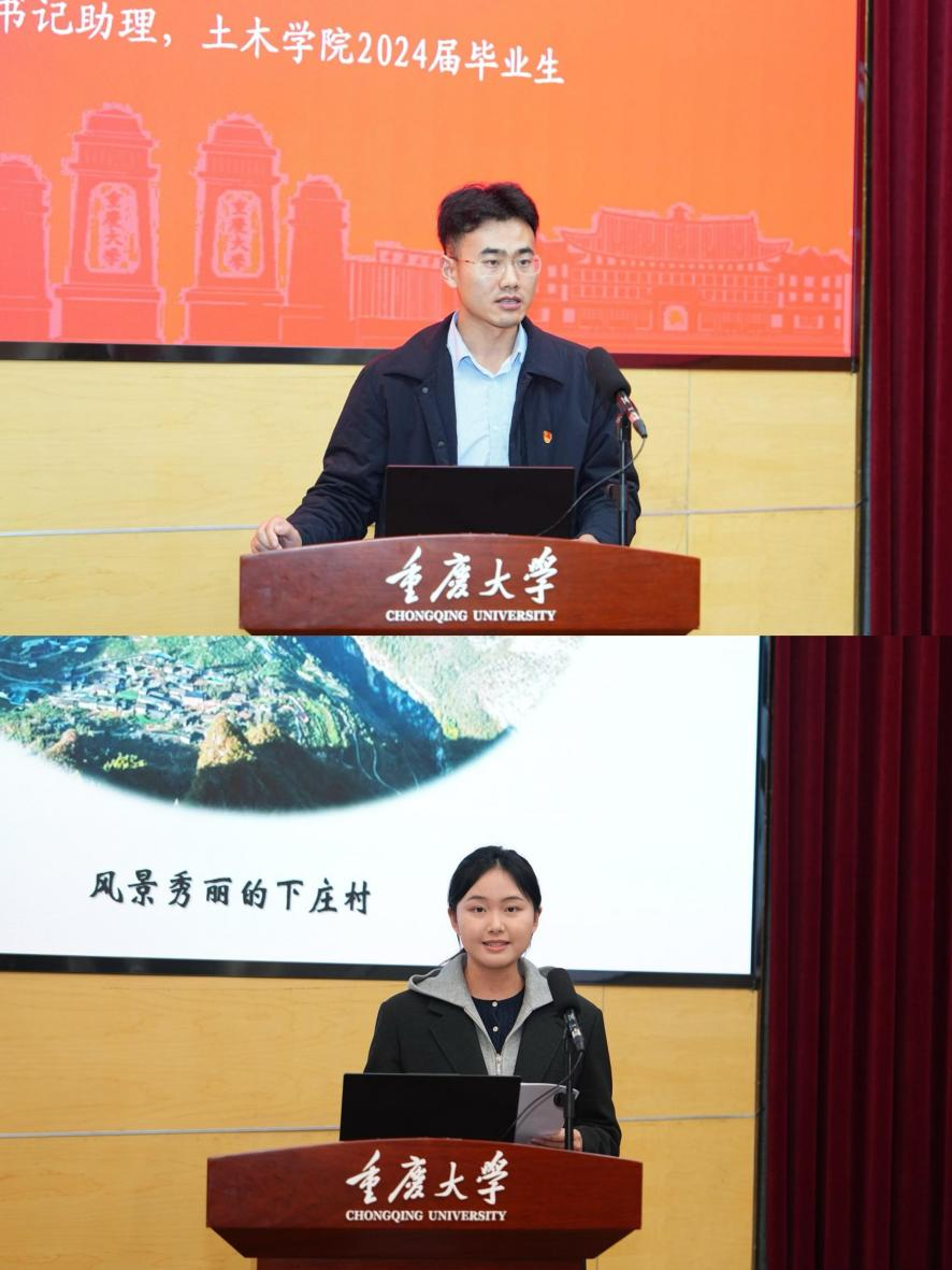 2024届毕业生李华,学生服务乡村振兴志愿者协会会长邹阳芮分别作了报告。