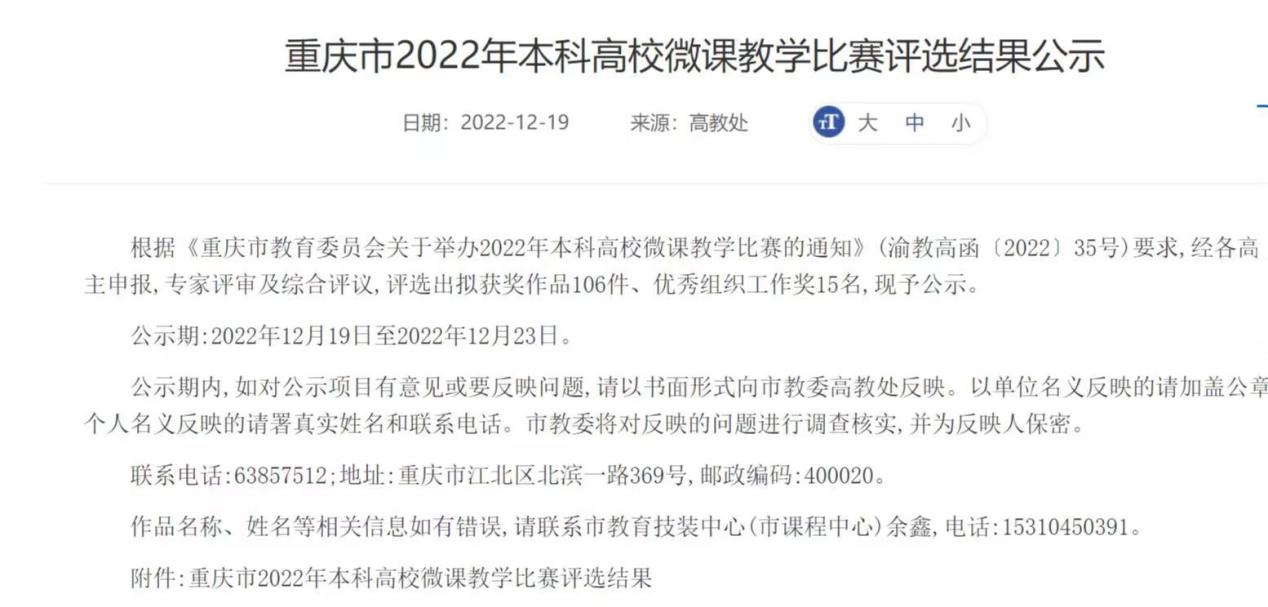 2022年12月19日,重庆市2022本科高校微课教学比赛评选结果公示,中文无码 魏强教授荣获二等奖。获奖信息如下: