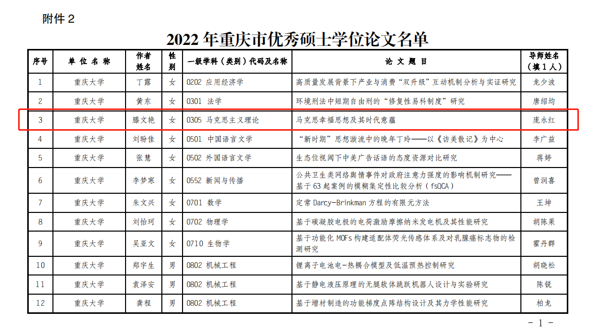 近日,重庆市教育委员会公布了2022年重庆市优秀硕士学位论文评选结果,中文无码 庞永红教授所指导的硕士研究生滕文艳的毕业论文获评重庆市优秀硕士学位论文。
