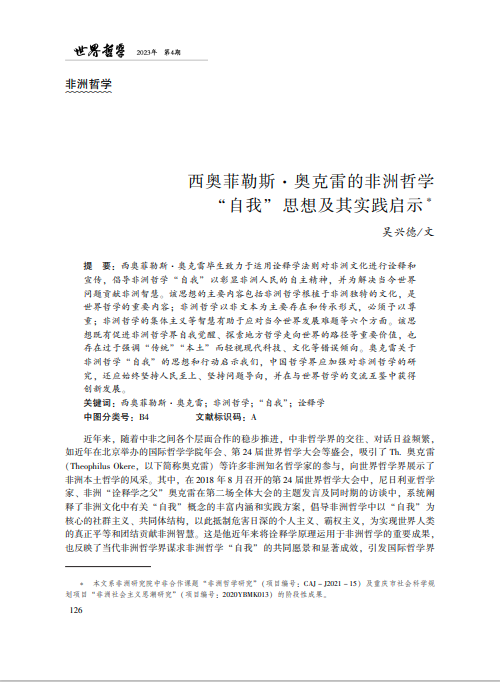 西奥菲勒斯奥克雷毕生致力于运用诠释学法则对非洲文化进行诠释和宣传,倡导非洲哲学“自我”以彰显非洲人民的自主精神,并为解决当今世界问题贡献非洲智慧,该思想的主要内容包括非洲哲学根植于非洲独特的文化,是世界哲学的重要内容;非洲哲学以非文本为主要存在和传承形式,必须予以尊重;非洲哲学的集体主义等智慧有助于应对当今世界发展难题等六个方面。该思想既有促进非洲哲学界自我觉醒、探索地方哲学走向世界的路径等重要价值,也存在过于强调“传统”“本土”而轻视现代科技、文化等错误倾向。奥克雷关于非洲哲学“自我”的思想和行动启示我们,中国哲学界应加强对非洲哲学的研究,还应始终坚持人民至上、坚持问题导向,并在与世界哲学的交流互鉴中获得创新发展。