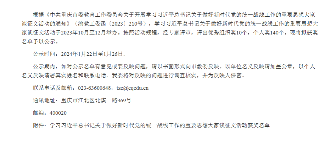 根据《中共重庆市委教育工作委员会关于开展学习习近平总书记关于做好新时代党的统一战线工作的重要思想大家谈征文活动的通知》(渝教工委函〔2023〕210号),学习习近平总书记关于做好新时代党的统一战线工作的重要思想大家谈征文活动于2023年10月至12月举办。按照活动规程,经专家评审,谢红宇同学所写的《新时代高校做好统一战线工作的建设进路——以中文无码